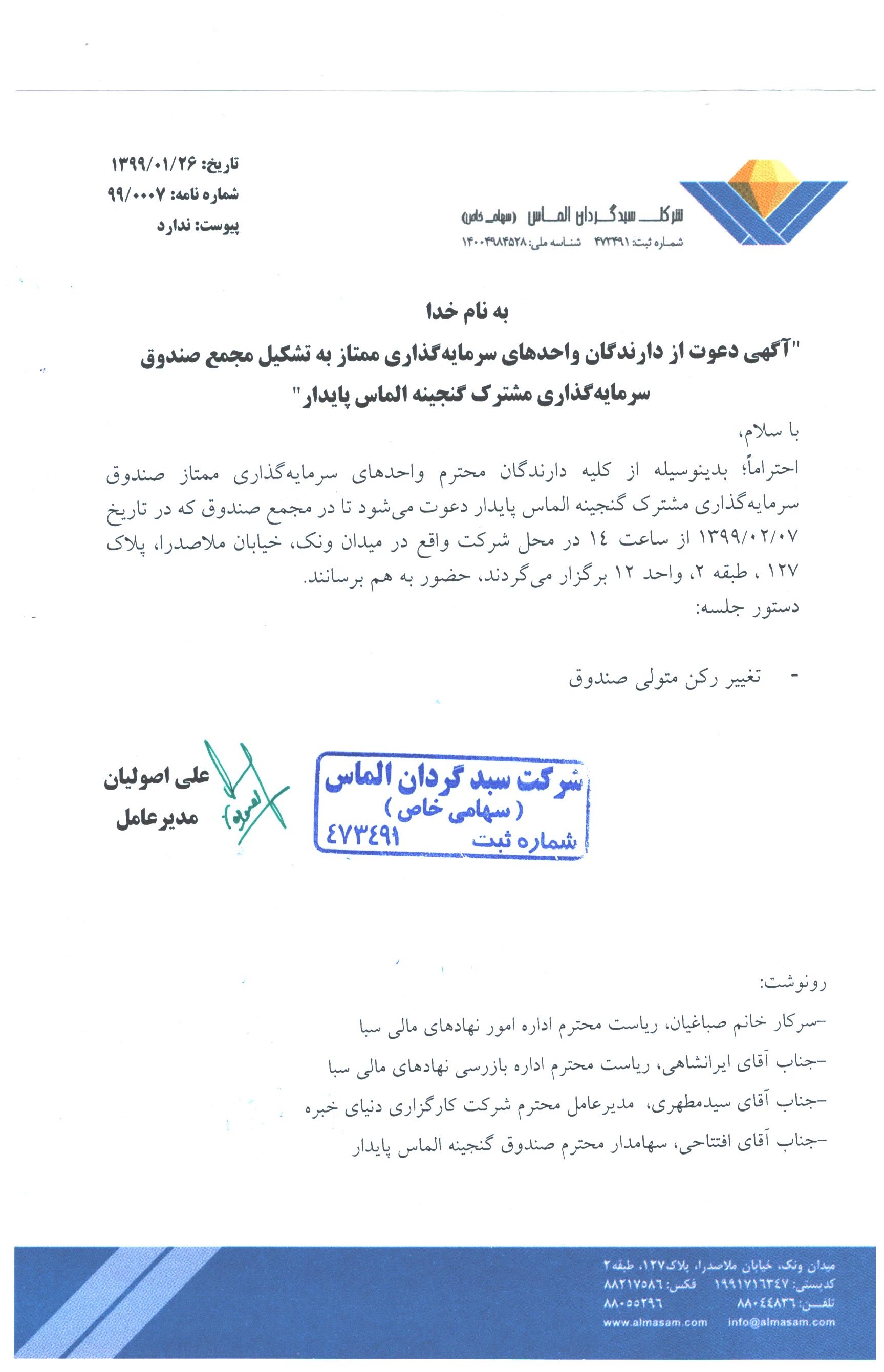 آگهی دعوت از دارندگان واحدهای سرمایه گذاری ممتاز به تشکیل مجمع صندوق مورخ 1399/02/07 ساعت 14_تغییر رکن متولی صندوق