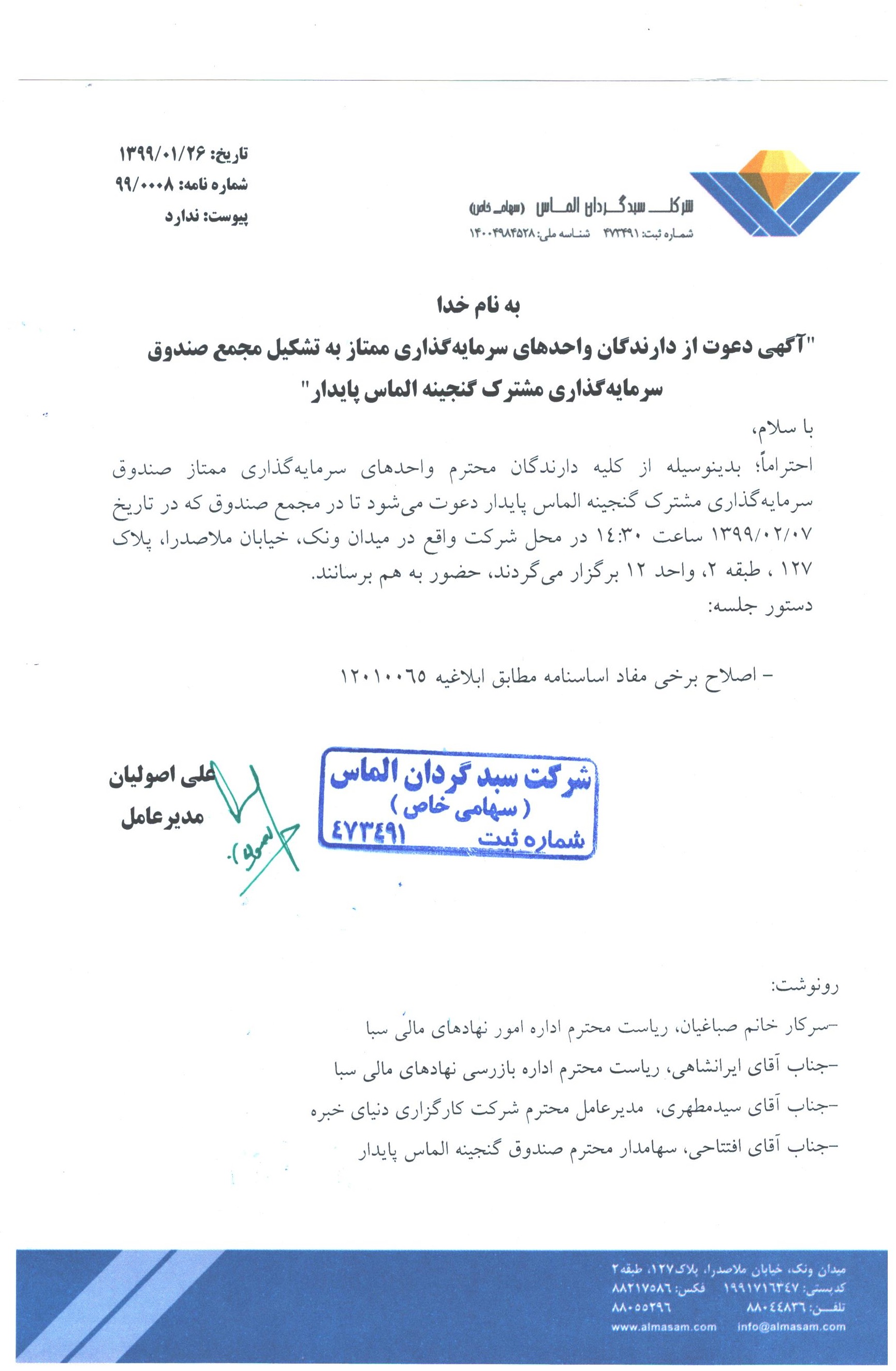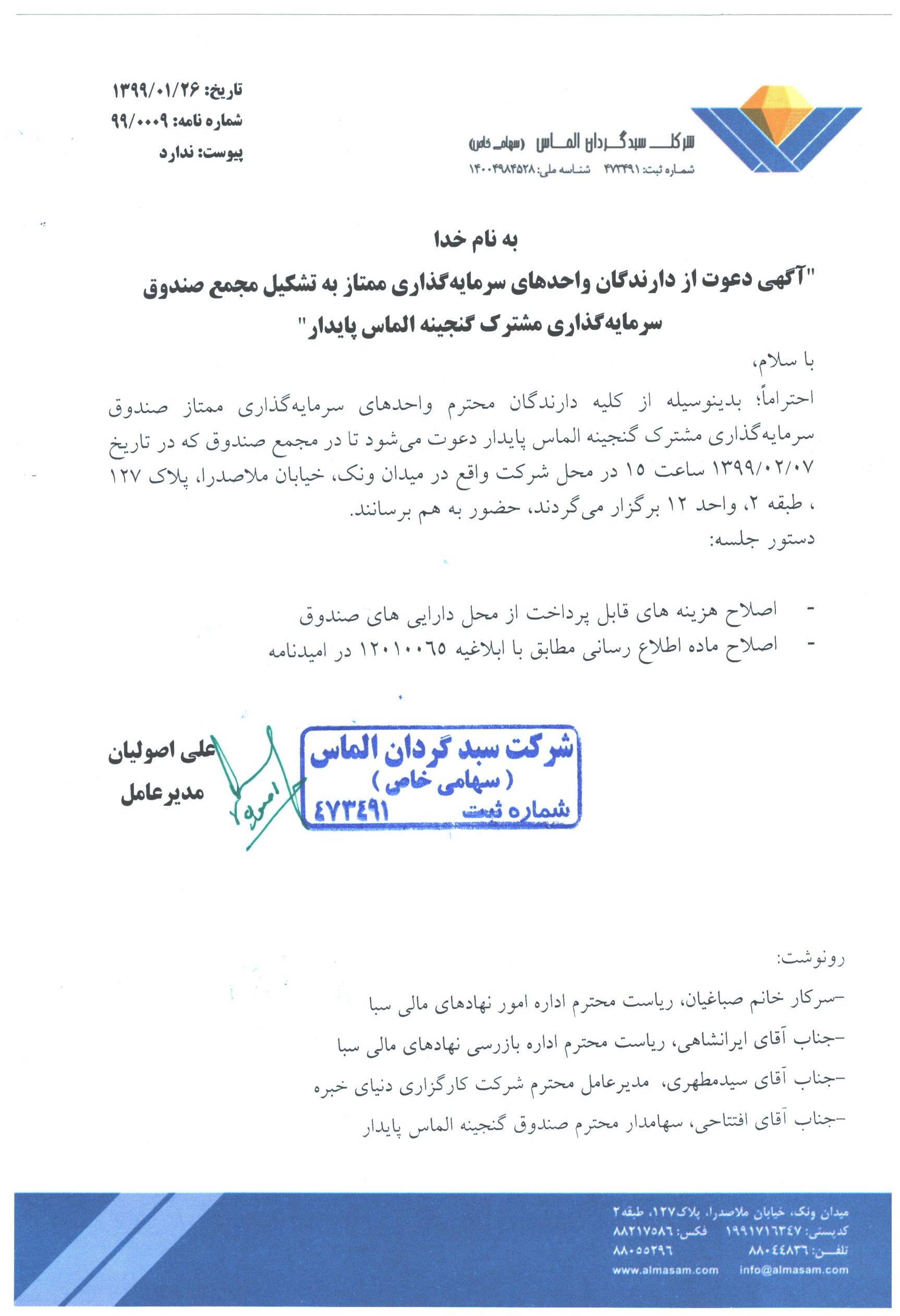 آگهی دعوت از دارندگان واحدهای سرمایه گذاری ممتاز به تشکیل مجمع صندوق مورخ 1399/02/07 ساعت 15-اصلاح برخی مواد امیدنامه