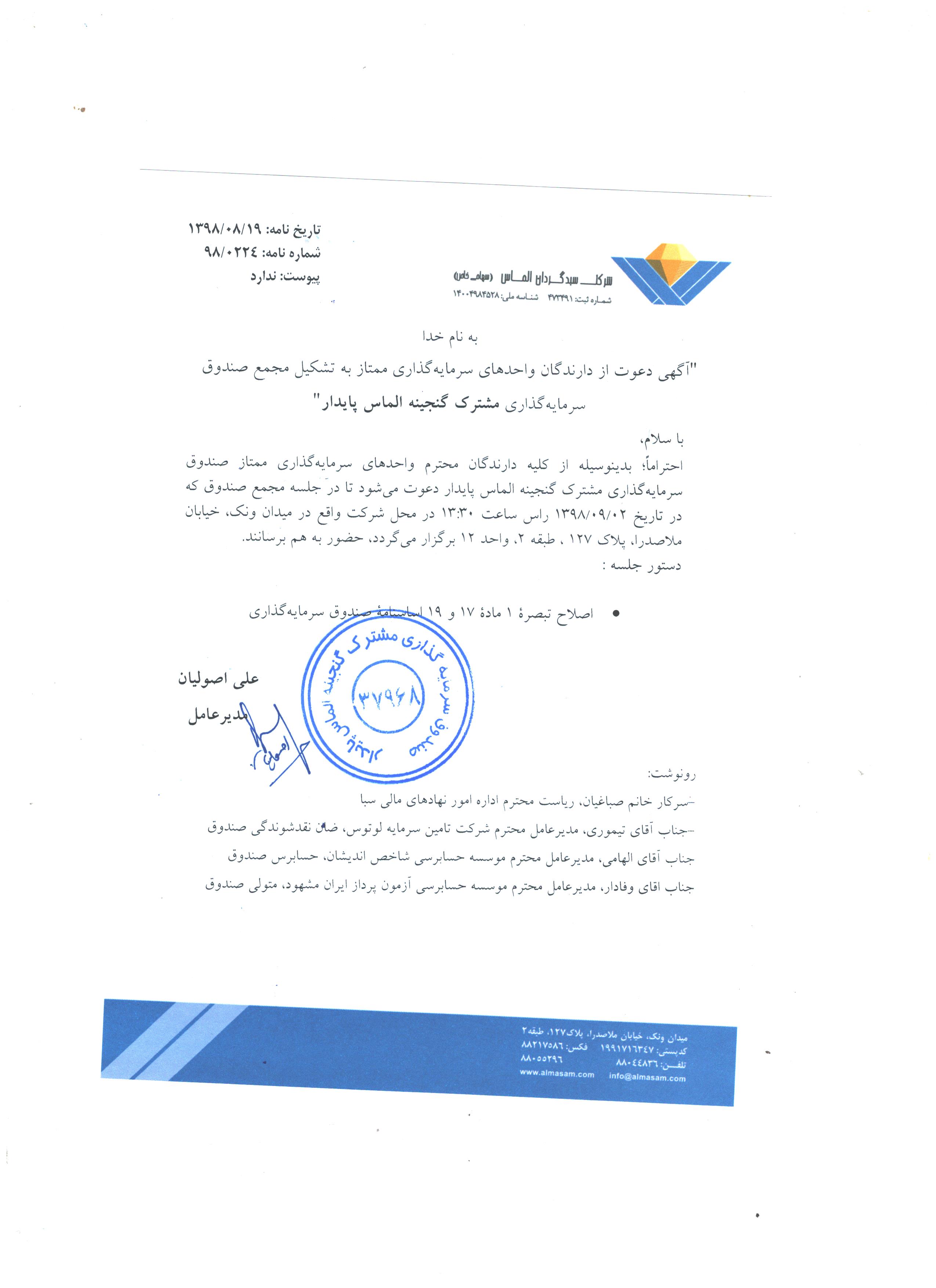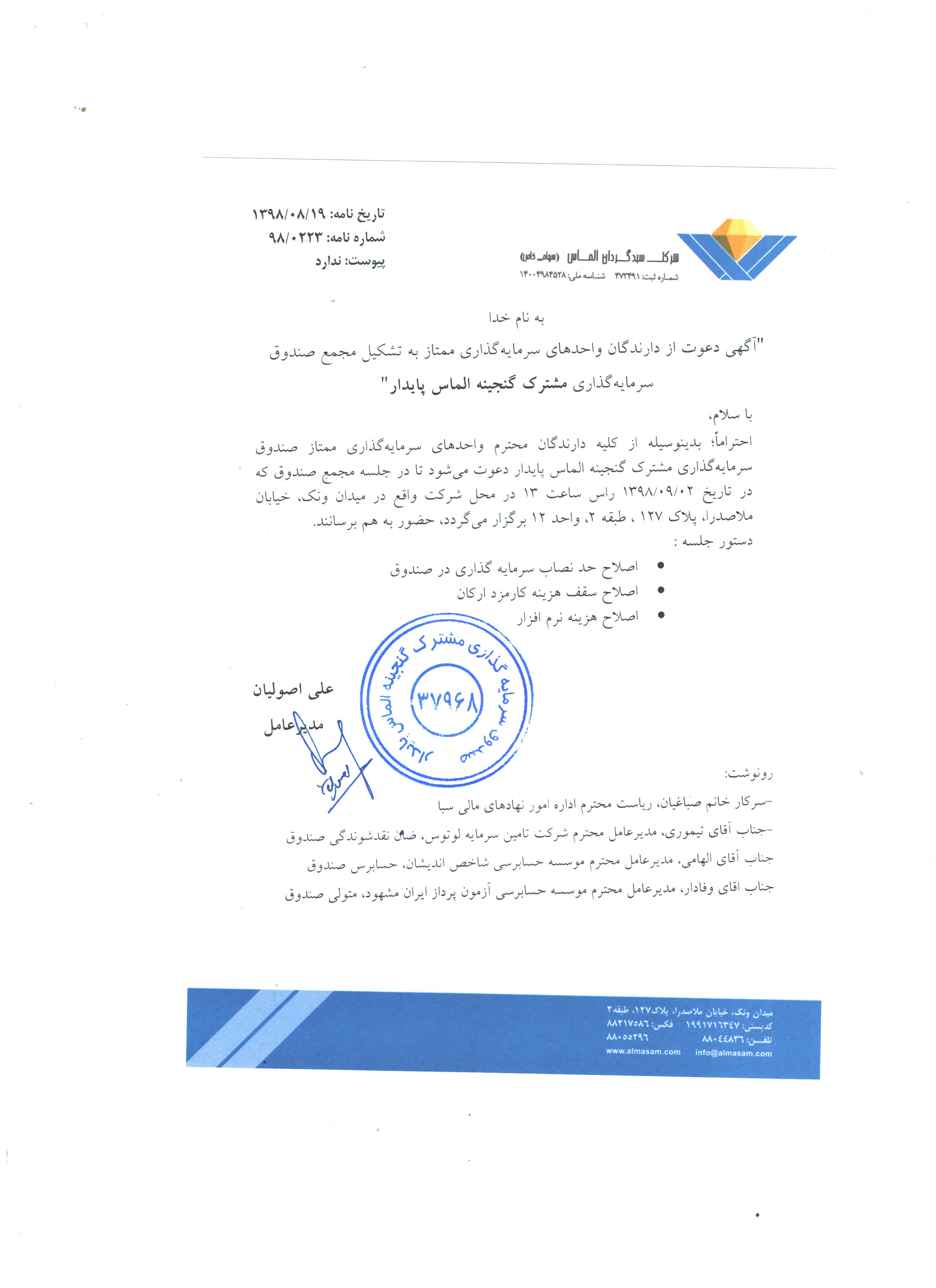 آگهي دعوت از دارندگان واحدهاي سرمايه گذاري ممتاز به تشكيل مجمع صندوق سرمايه گذاري مشترك گنجينه الماس پايدار مورخ ۱۳۹۸/۰۹/۰۲ ساعت 13:30