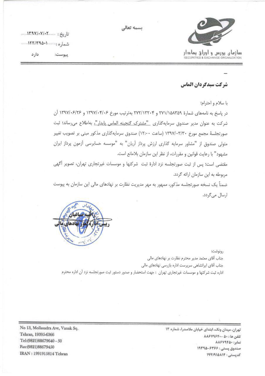 تایید صورت جلسه مجمع1397/03/30 صندوق گنجینه الماس پایدارتوسط سازمان